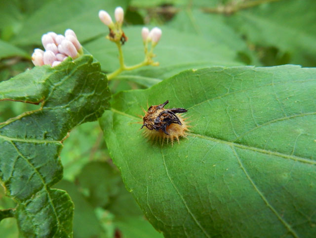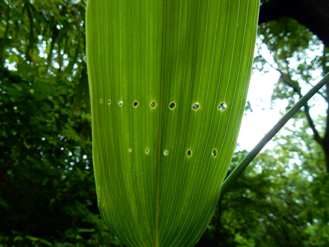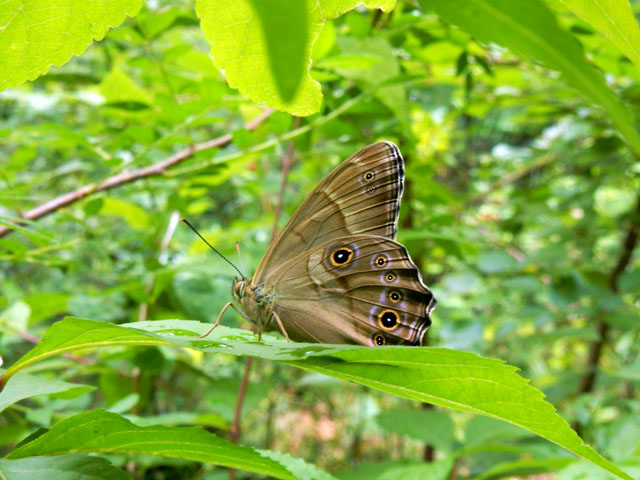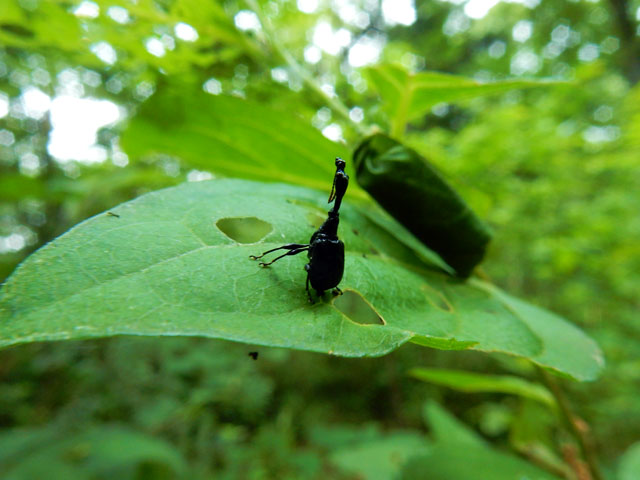 明るい木陰ではヒカゲチョウ(ナミヒカゲ)さんが羽を休めておりました。・°・。エゴノキの幼木の上に、たくさんのオトシブミの揺籃(ようらん)と、その近くに直立姿勢でじっと佇んでいる黒くて小さなオトシブミさんが何匹も居りました・・・後で調べてみたらエゴツルクビオトシブミという和名だと知りました。ちなみに立っていたのは首の長い雄ばかりのようでしたが、雄は揺籃作りには参加しないとのことで、いったい何のために立ちすくんでいたのかは謎ですが・・・もしかしたらメスの作った大切な揺籃を、外敵にやられないように見張っているのでは?という説もあるようです。・°・。大きな笹の葉に横一列のきれいな丸穴が空いておりました。これはまだ葉が展開する前の丸まった状態の時に、様々な虫によって穴を穿たれることにより、葉が開いた時に等間隔に穴が並んで見えるということのようです。・°・。◎雨上がりの散策記・その3へつづく・・・アトリエ☆イボヤギ 木村大介