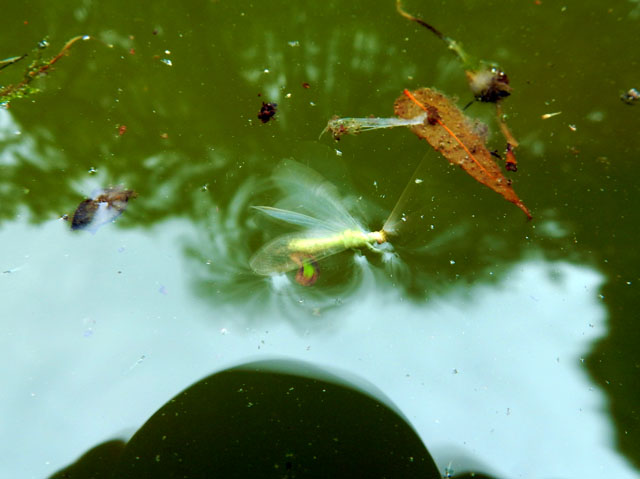 昨日の雨上がりの散策記・その2です・・・雑木林に挟まれた緑の多い公園にある小さな池では、アズマヒキガエルのお子さんたちはすっかり上陸を果たされたようで、子蛙の姿はありませんでした。・°・。水面に顔を近づけて、アオコで少し透明度の下がっている水の中を覗き込むと・・・写真にはうまく写せなかったものの、たくさんのメダカの稚魚が泳いでおりました。・°・。一匹のヤマトカゲロウさんが水面に浮いていたので、レスキューしたのですが羽の乾いて間もなく、飛び立って再び水の上に。。今度は落ち葉をあてがってすくい上げました。・°・。◎