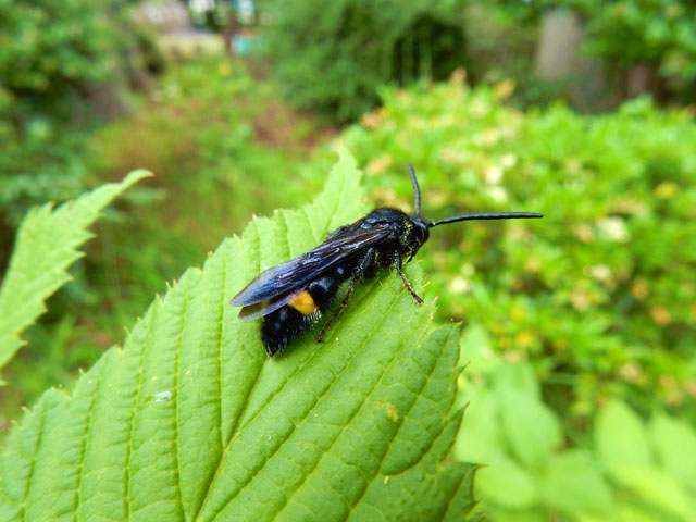 また、その近くではムーアシロホシテントウさんの、大変キュートな姿も見つけることが出来て、とても感激いたしました(*'-'*) 腹部に黄色い紋のあるキオビツチバチさんの雄もしばしば見掛けました。雄は雌に比べてとても長い触角を持っているのですぐに見分けがつきました。幼虫はコガネムシの幼虫を餌にしているそうです。・°・。しばらくして公営団地の庭沿いを歩いていると、すぐそばにツバメシジミさんが飛来して参りました。和名の由来となっているツバメのような尾状突起は失われておりました・・・閉じた羽の隙間から垣間見える青色で雄であることが判りました。・°・。雨上がりの散策記・その4へつづく・・・アトリエ☆イボヤギ 木村大介