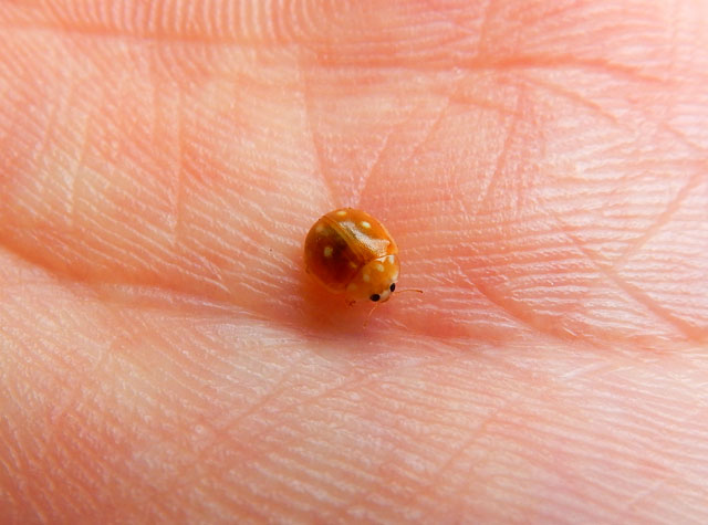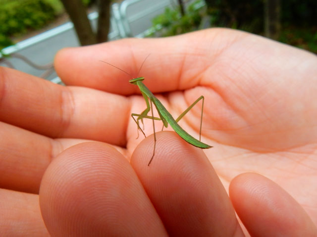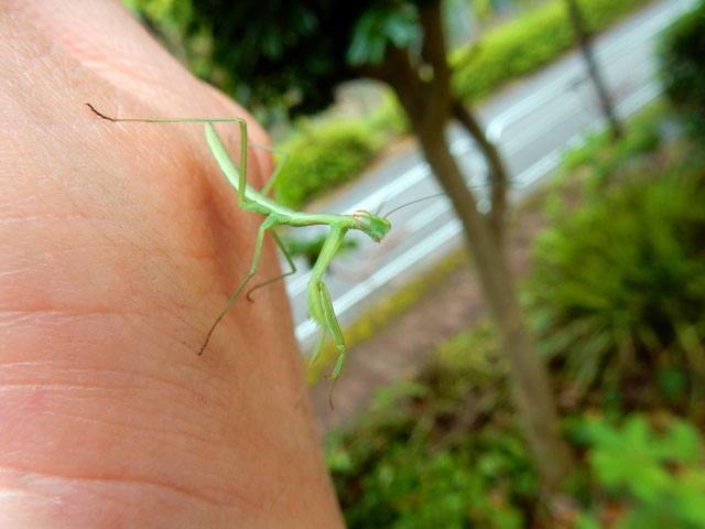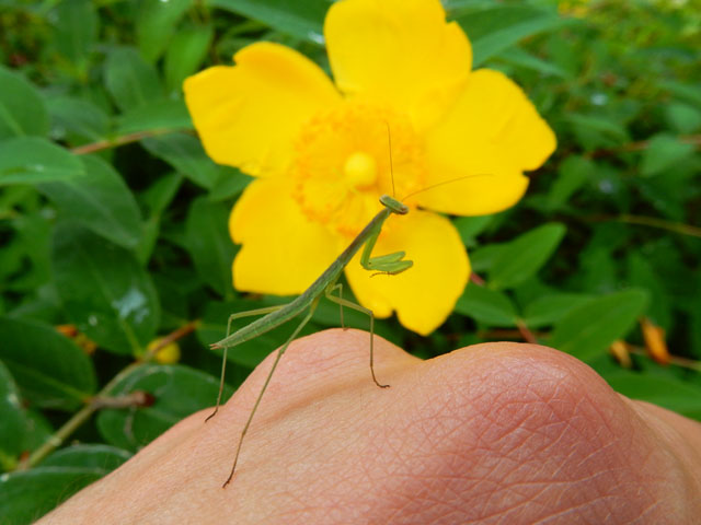 孵化してからしばらく育ったサイズのカマキリの子供に出会いました。結構肝が座っている個体で、指の上に誘導してみるとすんなりと乗り移って来て、手の甲の上で何やら思案しているようにも見えました。。にぎやかに咲いているヒペリカム・ヒドコート(セイヨウキンシバイ)の明るい黄色を背景に、なんだかサマになるポーズを取ってくれました(^^)