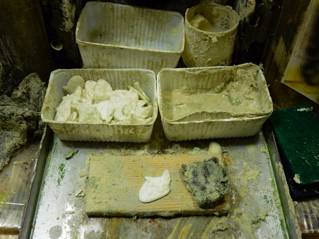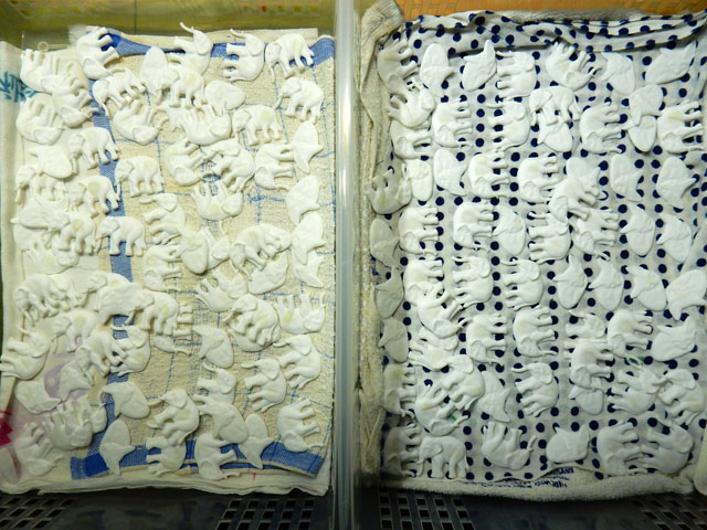 ここのところしばらく、ブローチの定番アイテムの制作に取り組んでおります。写真はフェネックの素材を表面を研磨剤を用いて磨き込んでいるところです。そろそろ気温と湿度の高い日も増えて参りましたので、数をこなしておりますとなかなかに汗ばむ作業となりました。・°・。(・・;) 長い時間掛かって研磨作業を終えた素材たちを、水で洗浄して研磨剤や削りかすなどをきれいに洗い流します。。布を敷いたバットに拡げて乾燥させて、次の工程に備えます。・°・。(`_´ )ゞ 玉子焼きをこさえようと鶏卵を割ったら、大小合わせた黄身が4つも入っておりました・・・(°▽°)!