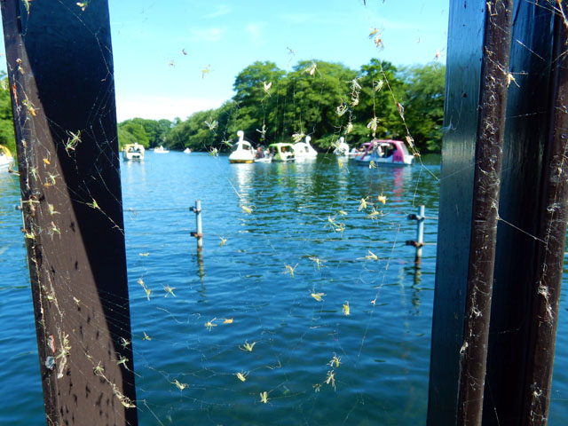 先週のよく晴れた日に、吉祥寺に用事があって久しぶりに井の頭池にも立ち寄りました。・°・。新緑の頃の前回よりも更に緑が濃くなっていて、七井橋から見下ろすと、池の底までくっきりと見えるほど水が澄んでおりました。・°・(°▽°) ボート池の方を見やると、好天に誘われてかたくさんのスワンボートが泳いでおりました。・°・。欄干に掛けられた蜘蛛の巣には、たくさんの羽虫が張り付いておりました。・°・。*
