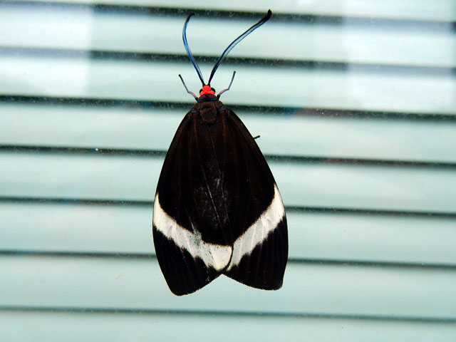 特設ステージではそれぞれの島の方々が、島に代々伝わる民謡や伝統的な踊りなどが披露されておりました。左端の写真は神津島水産研究会の現役漁師のみなさんが、マグロの一本釣りを模擬実演しているところで、撒き餌の代わりに客席に向かって駄菓子を投げ入れておりましたヽ(´▽`)/ わたくしも含めて老若男女、皆夢中で「撒き餌」に群がっておりました。。(笑) 午後からは、さかなクンによる「世界一受けたいお魚授業」も開講されて、楽しいクイズ形式のトークショーが繰り広げられました。・°・。会場を後にして、浜松町駅から歩いて新橋駅まで移動しました。途中にあったオフィスビルのガラス面に、ホタルガが数匹留まっておりました。ビルの周囲にある生け垣の葉を食べて育ったのでしょうか・・?よく見るとビルの壁面にも何匹か留まっておりました。・°・。*