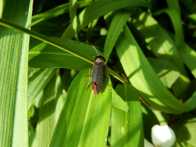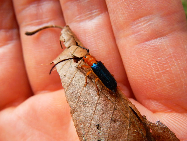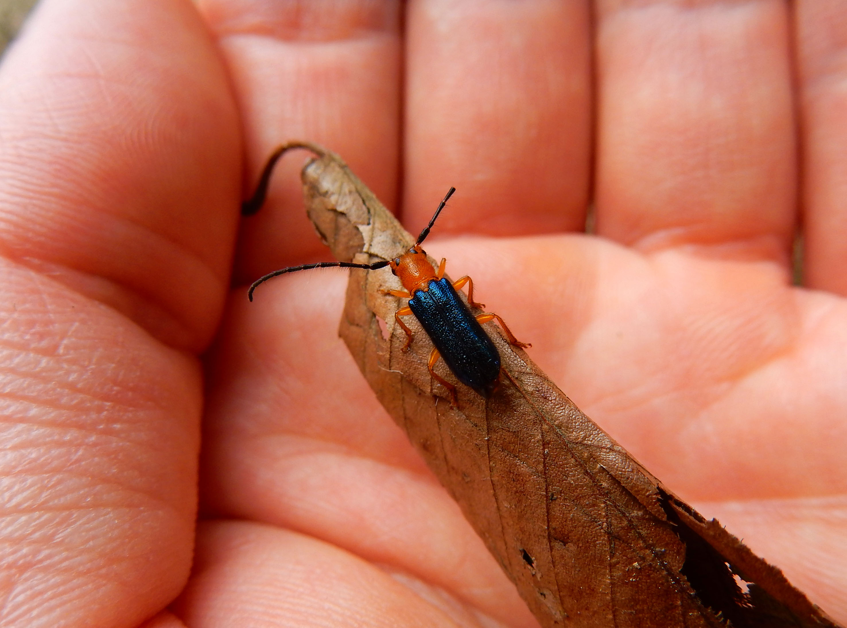 頭部がオレンジで腹部が青藍メタリックの甲虫を見つけました。カミキリの仲間かな?と思って調べたのですが、まだ種名が判りません。ですが・・・この虫の頭部を拡大して観て驚いたのは。。複眼が4つあるように見えた点です(*゜0゜)ゴミムシダマシの仲間やミズスマシではもともと一対だった複眼が、上下に別れて見かけ上4つに見えるという例は聞いたことがございましたが、そのパターンなのでしょうか・・?  草の茎の上に生まれて間もないと思われるカマキリの赤ちゃんを見つけました。脚には薄茶と焦茶色の縞模様がありましたが、何カマキリの仔かはまだ判りませんでした。・°・。*
