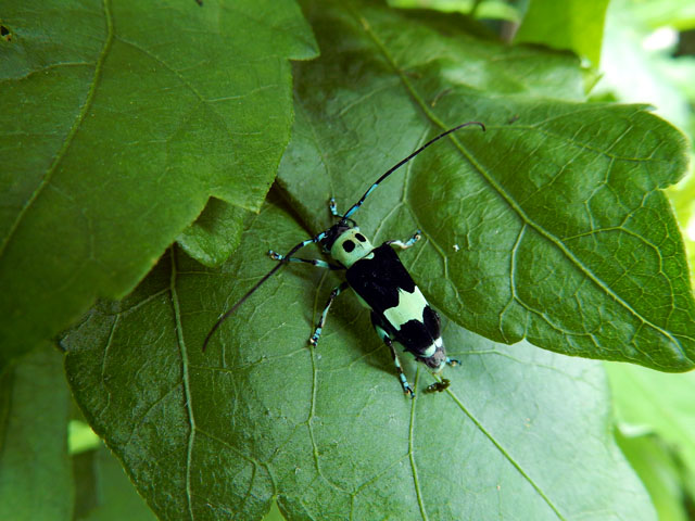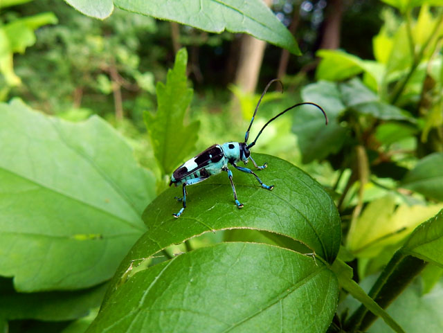 笹の葉の上にいたコメツキムシさんは、鞘羽の後ろの方が欠けておりました・・・何モノかに喰い千切られたのか、健気に生きる小さな野生の世界を垣間見た気がいたしました。・°・。フヨウと思われる小木の葉の上には、たくさんのラミーカミキリさんがおりました。明治時代に中国大陸から輸入した、ラミーという植物に着いて持ち込まれたというカミキリの仲間ですが、問題とされる外来種ではあるものの、薄い青と黒色の柄がとても綺麗だなと思いました。。パンダ柄にたとえられることもあるようですが、礼服を着たドクロのようなオドロオドロしい模様にも見えました。・°・。*エックス山訪問記その3へつづく・・・アトリエ☆イボヤギ 木村大介