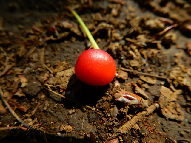 木漏れ日の差すアオキの葉の上には、スポットライトを浴びたキンバエさんが青緑色の輝きを放っておられました。・°・。ウグイスカズラの赤い実を拾ったので、近くに居た今時にしては珍しく大きなサイズの、ミスジマイマイさんの前に置いてみました・・・初夏のようなこんな陽気の日にしては活動的なマイマイさんでしたが、早速赤い実に興味を示してくれました。。