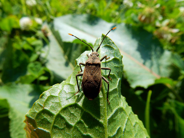 先日訪れた都立野川公園訪問記のつづき・その6です・・・園内にはところどころ明るい草むらがあって、シロツメクサの合間に生えているギシギシにも様々な虫達が集っておりました。陽射しを透かしてカメムシのシルエットが見えましたので、近付いてみますと・・ホオズキカメムシに似ている方がおりました。後で調べるとツマキヘリカメムシさんというお名前だと判りました。和名の示すように触角の先が黄色くて、素敵なアクセントになっておりました。・°・。川べりのシロツメクサの葉には、全身が青み掛かった黄緑色をした、キリギリスの仲間のお子さまがおりました。・°・。*