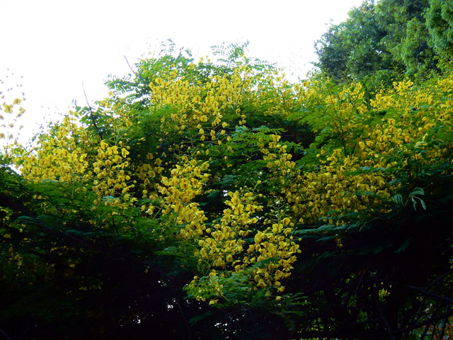 陽が傾いて人気もまばらな静かな楼門を過ぎて、万葉植物園に参りました。上向きに咲いていた黄色い藤の花はジャケツイバラでした。太くてゴツゴツとしたトゲの間では、大きなミスジマイマイさんが次の雨を待ってお休み中でした。・°・。◎