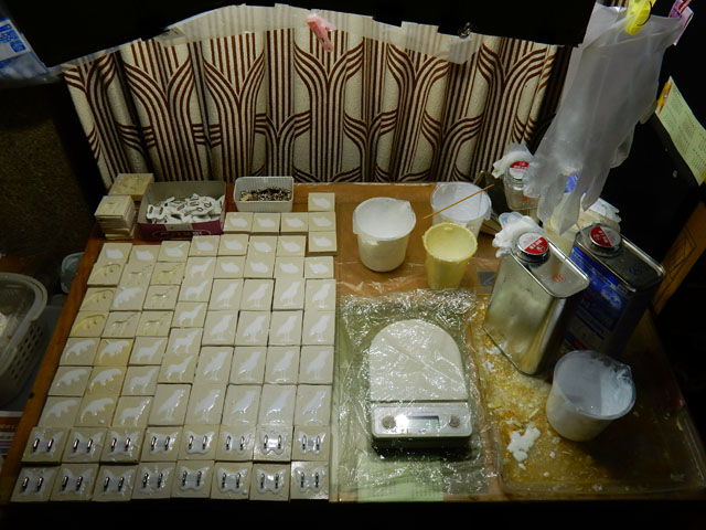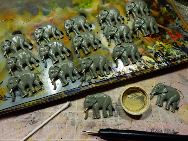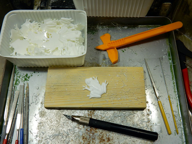 昨日の春の嵐の大雨で、近所の染井吉野もすっかり花びらが落ちてしまったかな・・?と思っておりましが、案外枝先にもまだまだにぎやかに花が付いておりました。・°・それでも水たまりになった桜の樹の周りには、美しい花びら模様が描かれておりました。・°・。風邪の症状がまだ残っておりましたが、鼻水の方は幾分ましになって参りました。・°・。本日は塗装の方を一旦中断して、新しく入ったオーダー品のバリ取り作業を、先に手掛けることにいたしました。写真はオキナワアオガエル・ブローチの細い指の間のバリ取りを行っている光景です。デザインカッターでは削りにくい箇所は、右上に置いてある先が鋸刃状になっている工具で削り取ります。・°・。◎