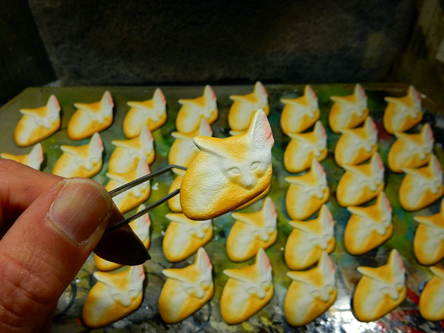 おととい辺りから微熱を感じておりましたが、昨夜から今朝にかけて鼻と喉の違和感も強くなりました・・・起きてからは熱の方は下がってきましたが、くしゃみと鼻水の流失がひどくて作業にも支障を来す程でした。。今朝もいつにも増してしっかりと朝食を摂って、快復に努めました。・°・。刻みキャベツの下にはナチュラルチーズを敷いて、マフィン・メンチカツサンドにいたしました。ゆで卵はうずらと鶏卵のダブルで、さらにシリアルと夏みかんを1個分いただきました(`_´ )ゞ  今日のアトリエ作業はブローチの塗装の続きを行いました。写真はフェネックのボディの、メインカラーをエアブラシで吹き付け終えたところです。この後、こげ茶色系で薄く上掛して毛の質感を高めます。・°・。先日雨戸にデルタ翼のカッコいいシェイプをしたモスを見掛けました。なんとなく近未来のステルス戦闘機をイメージさせられました。・°・。今回の蛾は無害のようでしたが、暖かくなってくると毒蛾も出没するので、雨戸を開け閉めする際には注意が必要です。・°・。(*゜0゜)アトリエ☆イボヤギ 木村大介