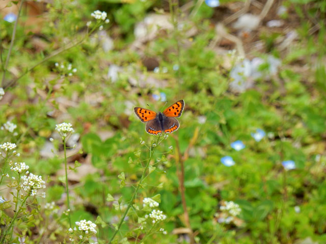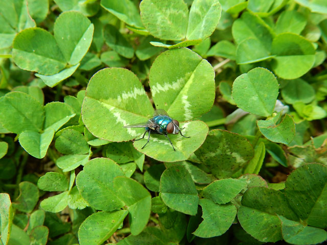 この雑木林の樹の肌には苔類がよく生えておりますが、地衣類のウメノキゴケも見かけました。・°・。林を抜けて史跡公園の広い草原に出ると、今年初めて観るベニシジミさんがおりました。・°・。5月並みの暖かさに恵まれたお天気のもと、花から花へと元気に飛び回っておりました♪  四つ葉のクローバーを探していると。。目の前の三つ葉の上に金緑色をギラつかせた、美しいキンバエさんが鎮座しておりました。・°・。(4/9(土)・その2へつづく)・・・アトリエ☆イボヤギ 木村大介