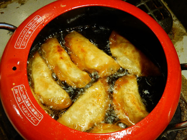 先日こさえたアップルプレザーブをもちいて、餃子の皮を使った揚げアップルパイを作りました。初めてトライしたので具を多く載せ過ぎて、包むのがやや困難でしたが・・・揚げている途中に漏れ出ることなく、なんとか無事に揚げ切ることが出来ました(`_´ )ゞ 作業に追われる多忙な中でも、ササッと手早く揚げ物をマスター出来るようになって来た、今日この頃です。・°・。ハードワークで疲弊した心と身体にも美味しい、うれしいひと品となりました(o^-^o)♪
