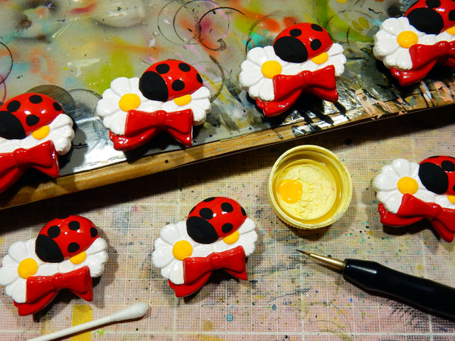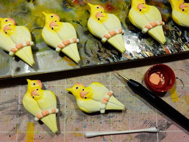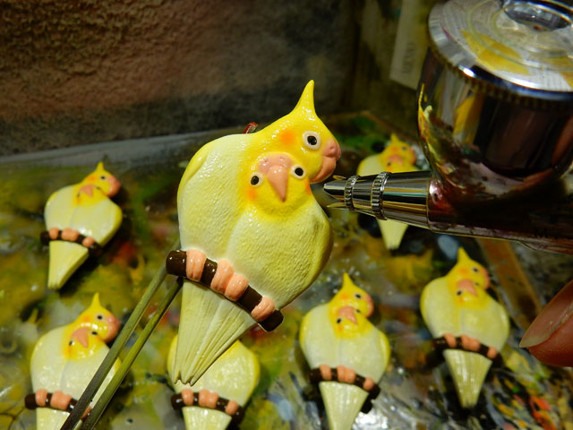 下地調整を終えた帯留め作品は塗装作業に入りました。・°・。写真は久し振りに再生産を行っているオカメインコとナナホシテントウです。オカメインコは今回はレモンイエローの体色が特徴のルチノータイプです。ペアの仲睦まじさをモチーフとした作品で、おかげさまでご好評をいただいております(⌒‐⌒) ナナホシテントウの方は、赤いリボンで包まれたマーガレットの花束の上に留まっている姿を象っております♪