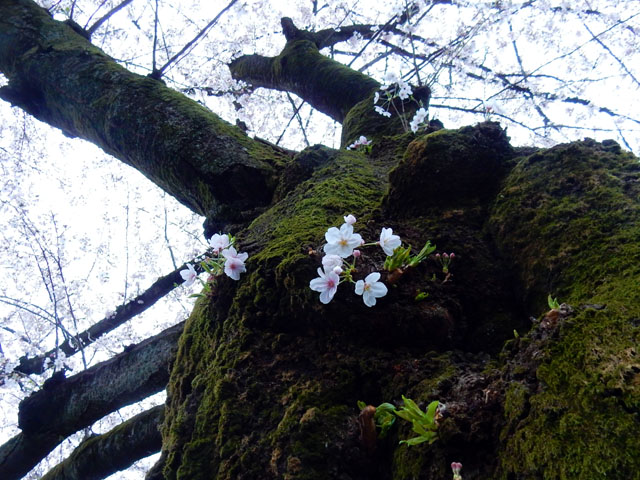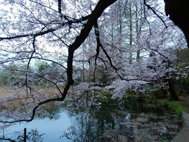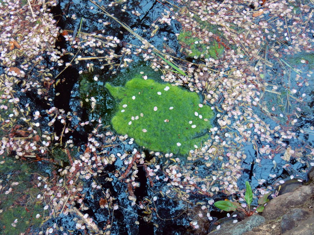 園内の染井吉野の樹には苔むしたものも多くて、ひこばえから咲いた花が目立つ樹もありました。水面を覆うように伸びた枝が、まるで薄桃色の天蓋のようにも見えました。・°・。花びらの吹き寄せられた水面の淀みに、アオミドロが島のように浮かんでいて、なんとなく笑っているピーマンの形に見えました・・・('-'*)
