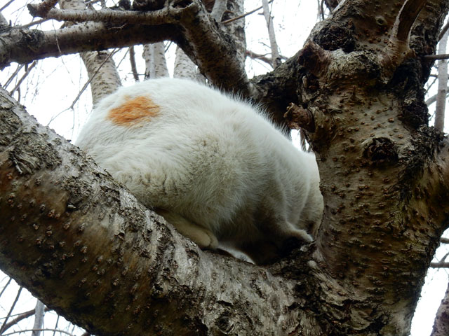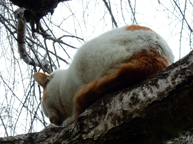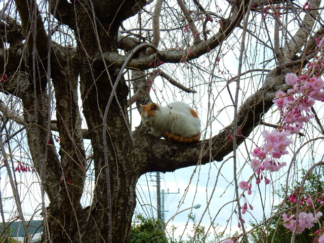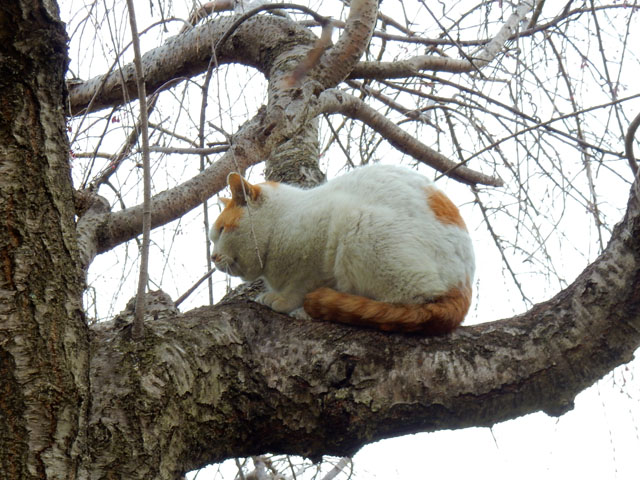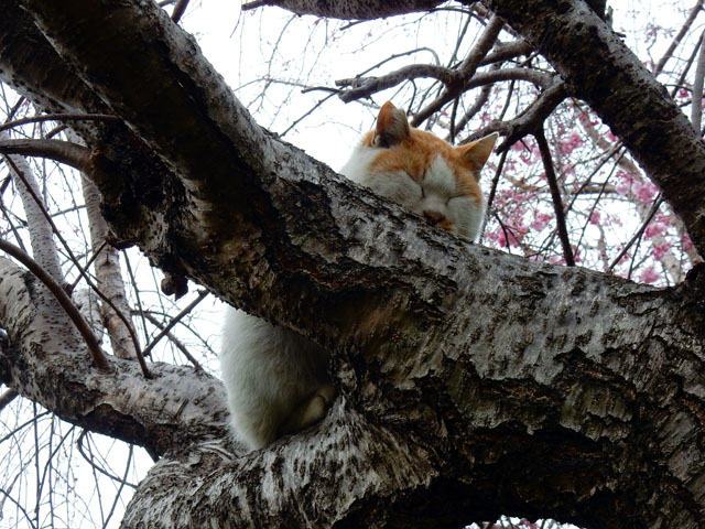 この辺りには普段から野猫たちの姿をよく見かけますが、枝垂れ桜の花を夢中で撮っていると、ふと、樹の上に白くて丸いものが居ることに気づきました・・・近寄ってみるとそれはちょくちょく見かける、白地に茶ブチ柄のある野猫さんでした。・°・。花見客で人出が多い週末でしたので、人の目にあまり触れずに樹の上でゆっくりと過ごしたかったのかな・・?あるいはいつものうたた寝ポイントだったのかもしれません。・°・。*