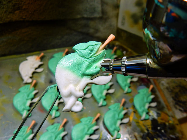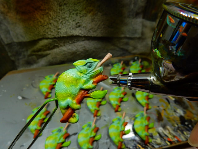 SNSやマスコミでも、ミモザの開花を告げる画像や話題をよく見聴きしておりましたが、うちの近所でも見事なミモザの花が咲き乱れておりました。・°・。高さは3メートルを優に超える大木で、春の強い風にゆられながら、青い空を背景にまぶしいくらいに黄色い花を目立たせておりました。・°・。* アトリエではブローチ作品の塗装作業を進めました。写真はエボシカメレオンのメインカラーをエアブラシで吹き付け塗装しているところです。ミントグリーンを塗り終えたら、その上にライムグリーンで縞模様を重ねてゆきます。・°・。今宵は上弦を少し過ぎた月齢8の月が澄んだ夜空に輝いて見えました。・°・。◯ アトリエ☆イボヤギ 木村大介