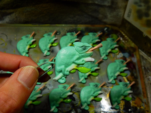 本日も納期の差し迫ったブローチ作品の制作に取り組みました。・°・。写真はエボシカメレオンの塗装風景です。拙作・ブローチ作品の中では最多の色数を要するアイテムのため、完成に至るまでの苦労も多いのですが、色を塗り重ねる度にカメレオンらしさが増してゆくのを目にするのは、苦心の報われる過程でもあります。・°・。(*_*)  アパートの側の緑地公園で毎春見かける青紫色の花は、どうやら原種系のヒヤシンスのようでした。近年の大変ゴージャスな園芸品種と比べると随分と質素な雰囲気ですが、わたくしはこの素朴な感じがとても好きで毎年開花を楽しみにしております(⌒‐⌒)♪ アトリエ☆イボヤギ 木村大介