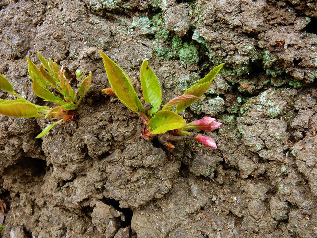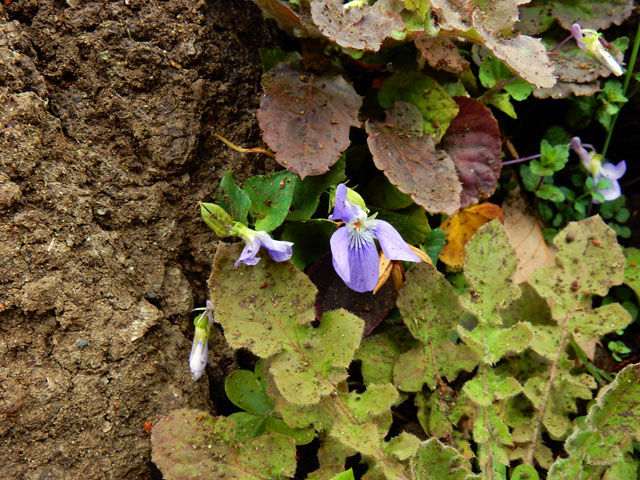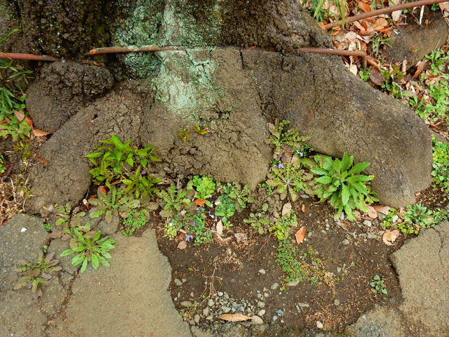 週末の雑木林散策のつづきです。・°・。染井吉野の樹の根元にちょっとした野草園が出来上がっておりました。・°・。太い根に挟まれるように生えているタチツボスミレは、雨だれの泥飛沫に汚されつつも健気に咲いておりました。・°・。地面に近い樹皮から直に生えた芽からは、小さなつぼみも膨らみ始めておりました。・°・。*