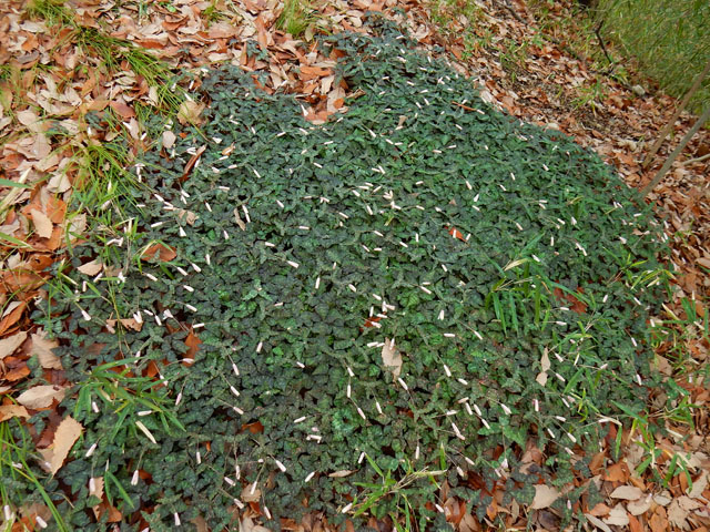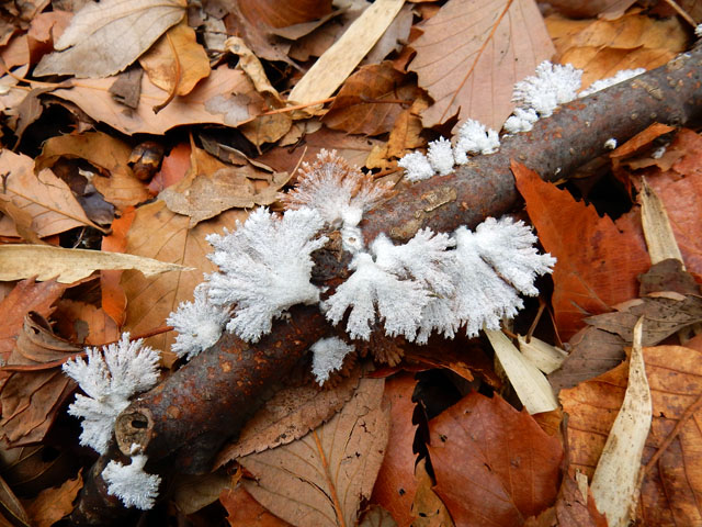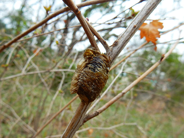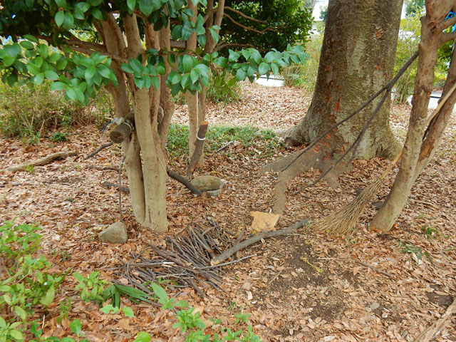 地面ばかり観て歩いておりましたが、腰ぐらいの高さに目を転じるとハラビロカマキリの卵鞘がありました。卵の中身が無事であれば、もう間もなくの辛抱で仔カマキリたちも旅立てることでしょう(孵化した後の卵鞘がどうなるのか知らないので、もしかしたら古い抜け殻かも・・?) 丘陵地の雑木林を出て公園の中を歩いていると、子供達の作りかけと思われる秘密基地?に遭遇しました。。秘密と言うには人通りのある歩道の脇ですが、完成形が密かな楽しみになりました(^^)