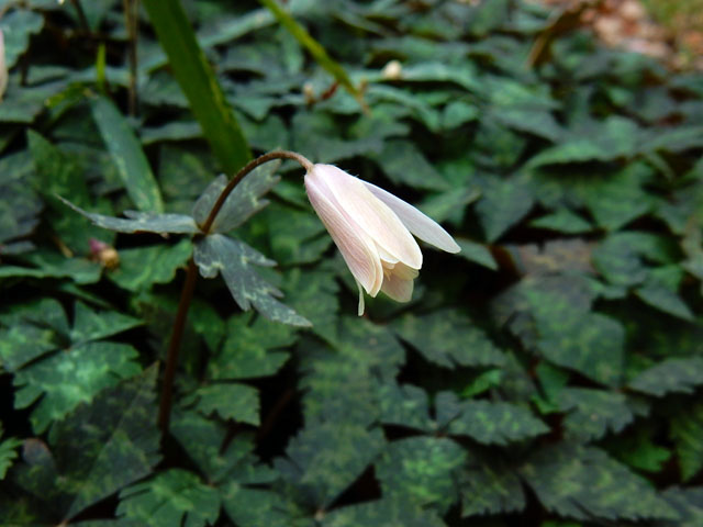 不意に笹藪の中から小鳥が飛び出して来て、フェンス沿いに何かをつつきながら移動するのを見ていると・・突然ホーホケキョケキョと鳴きました(°▽°)! 今年初めてのウグイスの鳴き声を、目の前で聴くことが出来てたいへん感激いたしました(≧▽≦)♪ ウグイスの姿は冬の間も結構目にしておりましたが、今日は林のあちらこちらで鳴き交わす声が響いておりました。・°・。わたくしも鳴きマネをしてみましたが、ちゃんと返答していただけているようでした(⌒‐⌒)♪ 緩やかな斜面にパクチーのような葉をした植物の群落を見つけました。空が薄曇りで暗かったせいでしょうか?うっすらと桃色がかった白い花は半開きでしたが、とても清楚な美しさを感じました。後で調べてユキワリイチゲという、キンポウゲ科イチリンソウ属の多年草だと知りました。今度は明るい日に行って、花を開いた姿も見たいなと思いました。・°・。*