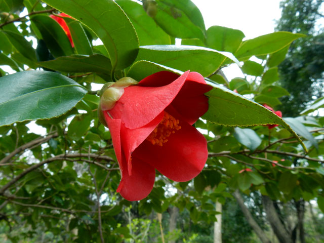 週末の雑木林散策のつづきです。・°・。度々ご紹介しておりますがこの丘陵地一帯は湿度が高めのようで、至る所で苔の絨毯や緑に覆われた岩や樹肌を目にします。・°・。ひと雨降ると緑色が一層鮮やかになり、目にもやさしい光景に癒やされております。・°・。林の中では朱色掛かった、鮮やかな赤色の椿の花が咲いておりました。野生種なのでしょうか・・?一重咲きの野趣に富んだわたくし好みの椿でした。・°・。◎