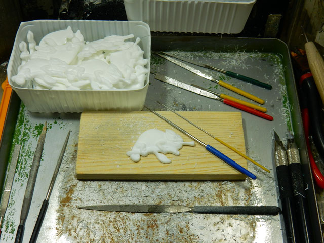 アパートのすぐ目の前にある細長い緑地公園で、今年もトサミズキの花が咲きました。・°・。薄緑がかった黄色い房咲きの花から、赤いシベがのぞいておりました。・°・。アトリエではただ今、帯留めとブローチの生産を進めております。写真はエボシカメレオンの棒ヤスリがけの様子ですが、樹の枝につかまり歩きしているポーズのため、枝葉の部分も含めて入り組んだ形状をしておりますので、棒ヤスリの形状を替えながらバリ取りを行っております。・°・。最近チャーハンをよくこさえております。キャノーラオイルの在庫消費のため、ここのところ揚げ物が多いので、揚げ油の残りを炒め物に活用しているためでもあります。特に鶏肉を揚げた後の油はよい味と香りが付くので、出汁入り油としても重宝しております♪ 今回はちりめんじゃこを使ってじゃこチャーハンにいたしました(o^-^o) 油を多めにしているのでカロリー高めですが、連日のハードワークには腹持ちが良くて適しております(`_´ )ゞ アトリエ☆イボヤギ 木村大介