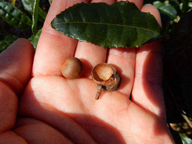フキノトウが食べ時の我が住まいの古アパートの裏庭では、夏みかんの樹もたくさんの実を付けております。色は山吹色で美味しそうになりましたが、まだまだ酸味が強過ぎるので、あとひと月ほど待って、試食するのを心待ちにしております♪ 近所の大通り沿いにあるミモザの花が満開となって、強い風にあおられて大きくゆれておりました。・°・。真っ青な空に陽光をたっぷりと受けた黄色い花がとてもよく映えて見えました。・°・。(*^ - ^*) よく行く雑木林の中で、お茶の樹を見つけました・・・最初はこんなところにお茶の樹が?と思って、葉をもんで匂いを嗅いだものの、今一つ判りませんでしたが。。よく見るとお茶の実が成っておりましたので、間違いなさそうです。ひとつを割って種を取り出し、近くの地面にそっと蒔いてみました。・°・。2017/02/23(木) アトリエ☆イボヤギ 木村大介
