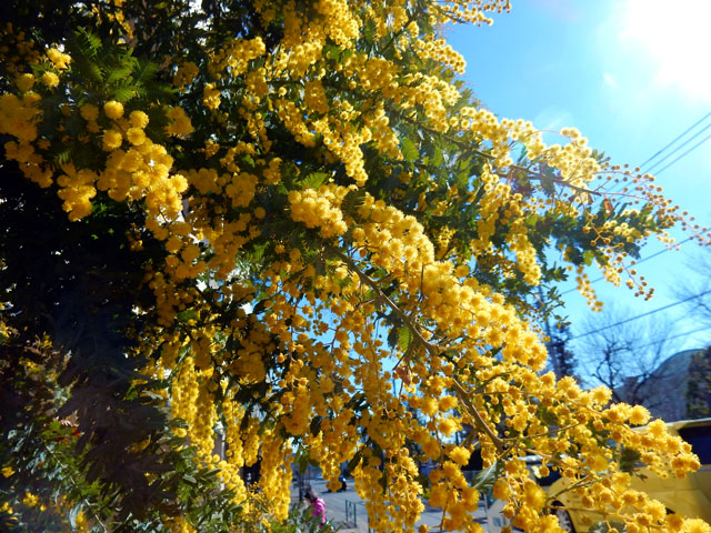 〈本日のタイトル解説:『 青い空 ミモザの黄色も よく映えて。・°・。(*^ - ^*) 』〉