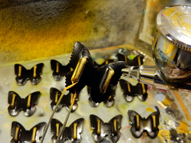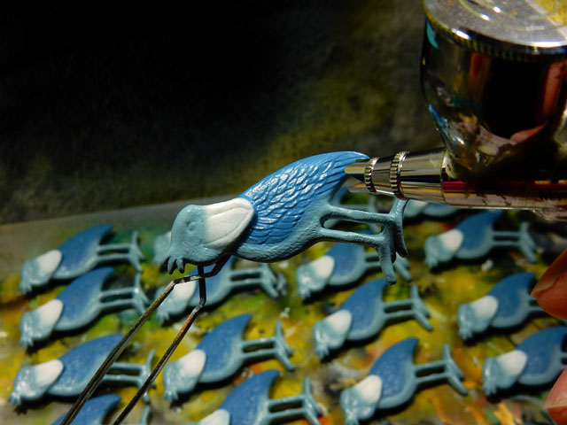 今週は寒さの堪える日が続きましたが、今日は朝からお日さまがよく照ってくれたおかげで、昨日までと比べると過ごしやすくなりました。・°・。春色蝶の塗装に区切りが付いたので、定番アイテムたちの塗装を再開いたしました。・°・。写真はハシビロコウ・ブローチの吹き付け塗装をしているところです。羽色の淡い順に3色を塗り重ねて参ります。・°・。年賀状のお年玉くじの交換になかなか行けなくて、本日ようやくは済ませて参りました。今年は受け取った総枚数に対しての、切手シートの当選確率がやや高めでございました。・°・。日頃くじ運の無いわたくしにしては、年に一度のラッキーデェイと言えそうです♪ 差し出してくださったみなさまには、この場をお借りして感謝申し上げます(^-^ゞ 過去には一度だけ、ふるさと小包が当選した経験がございました(o^-^o)。・°・。閉店間際の最寄りのスーパーで、値引き品をあさりに行くことがしばしばこざいますが、たまに握り寿司詰め合わせパックが半値引きでゲット出来た時には、とてもテンションが上ります♪ また明日も仕事をがんばれそうな気がしてきます(`_´ )ゞ わたくしにとっては一応「回らないお寿司」のひとつです・・(笑) アトリエ☆イボヤギ 木村大介