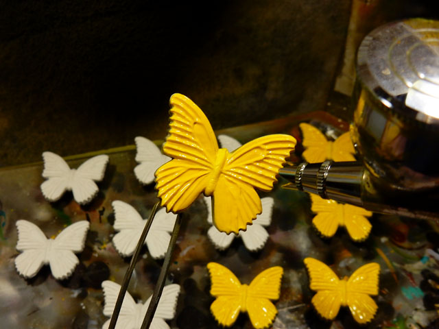 一度にまとめてたくさん揚げておいた鶏の唐揚げは、朝のサンドイッチの具材としても大変重宝いたします。・°・。マスタードをトッピングすると、甘酸っぱいパンチも効いていっそう美味しくなります♪ 本日も帯留めの春色蝶の塗装を進めました。写真は羽の縁を焦茶色で吹き付け塗装しているところです。とても細いラインなので、微妙な吹き加減で慎重に吹き付けて参りますが、マスキングをしてしまうと自然なグラデーションが表現できないので、このように真剣勝負でこなしております。・°・。(+_+) じゃがいもが値引き処分になっているのを見かける度に買い込んでおりましたら、先にゲットした分から芽が出始めておりましたので、今夜は大鍋でカレーをこさえました。じゃがいもを3種類とりまぜて入れたので、色味も硬さも様々になりましたが、それはそれで違いを楽しめるおいしいカレーとなりました。・°・。(o^-^o)♪