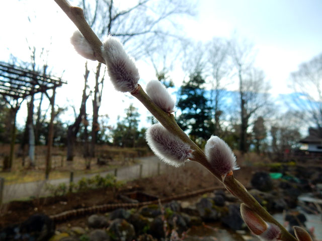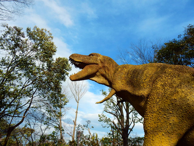 梅以外にもノシランの大粒で青藍色の美し実や、水辺にはネコヤナギの暖かそうな産毛が密に生えた花穂が観られました。・°・。また園内には巨大なティラノサウルスの復元模型もございました。過去に郷土の森博物館で恐竜展を開催した縁で、国立科学博物館から寄贈されたそうです。・°・。木立の中から忽然と姿を現されると、なかなかに迫力がございました・・(*゜0゜)
