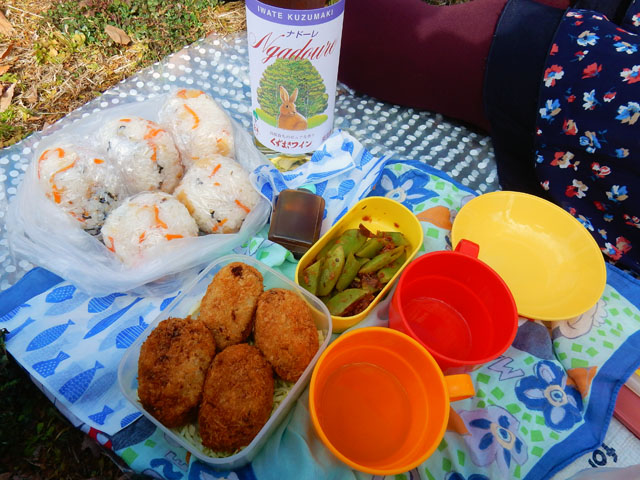 郷土の森の梅まつり散策の続きです。・°・。小高い丘の上の梅の樹の下でレジャーシートを敷いてお昼にしました。・°・。友人と持ち寄ったピクニックランチと、くずまきワインでそよ風に漂う梅の香りに包まれながら幸せなひとときを過ごしました。・°・。わたくしは五目ちらし寿司ご飯でこさえたおにぎりを、友人はひと口サイズのコロッケとスナップエンドウの梅鰹和えを作って来てくれました。・°・。(o^-^o) お腹を満たした後は緩やかな丘を下って再び梅見を楽しみました。紅白の花が同じ樹に咲く「思いのまま」という品種はひとつの花で2色が咲き分けるものもあって、とても華やかで楽しい品種でした♪