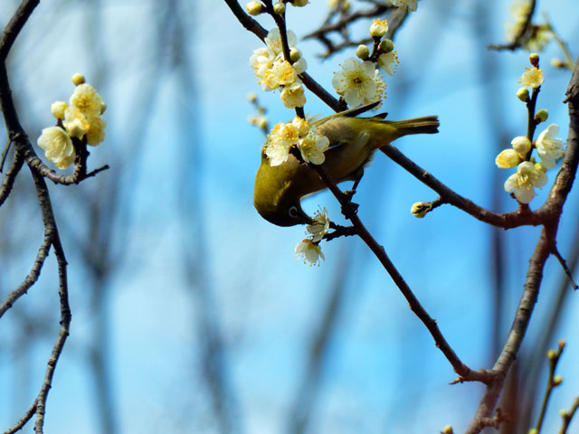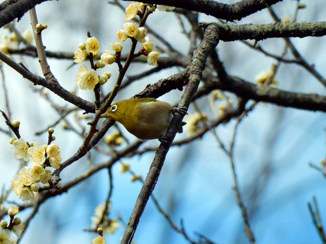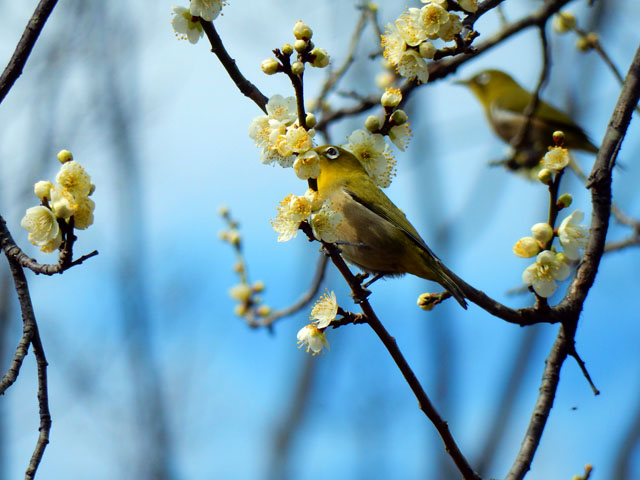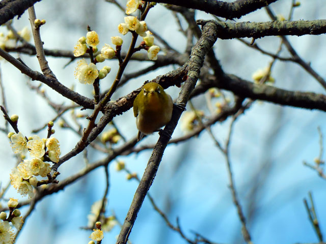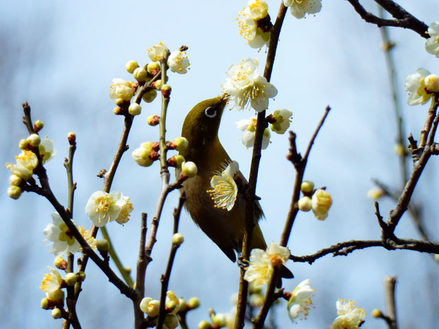園内にはメジロの姿をよく見かけました。・°・。梅の花にクチバシを差し入れては、盛んに蜜を吸い集めており、黄緑色の羽色と眼の周りの白いリングで、来園者の目も楽しませておりました。・°・。◎