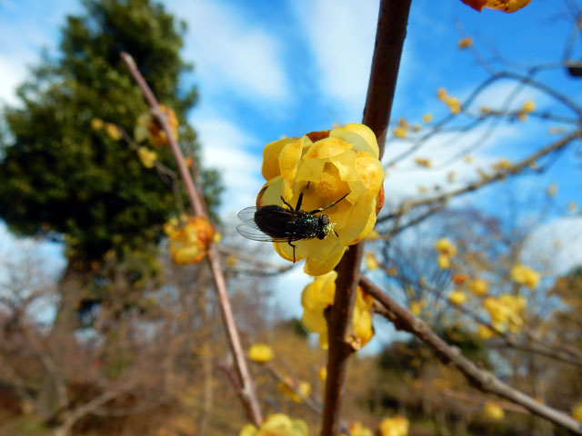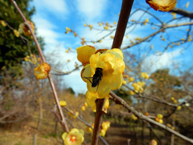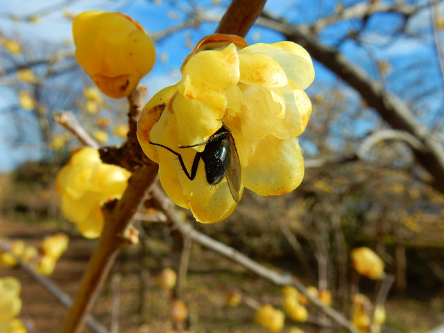 先月訪れた蝋梅園はほとんどの樹が既に花を散らしておりましたが、中にはまだ咲き続けていてほのかに芳しい香りを放っておりました。・°・。陽気と芳香に誘われたのか、一匹の黒い蝿が花の中に頭を入れて夢中で蜜を漁っておりました。ようやく顔を出すと、その頭にはたくさんの黄色い花粉が付いておりました。・°・。*