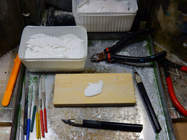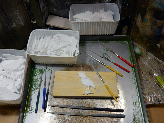 今朝も冷え込みは一段と弱まって、外に置いたバケツには氷が張っておりませんでした。・°・。昨日よりも少し欠けた月齢約19のお月さまは、澄み切った西の空で白く輝いて見えました。・°・。◯ 寒さが緩んで最高気温は12度程まで上がり、足元の冷えもなく快適にアトリエ作業に取り組むことが出来ました。・°・。写真はハシビロコウ・ブローチ作品の、素材周縁の細かいバリを棒ヤスリで削り取っているところです。・°・。* アトリエ☆イボヤギ 木村大介