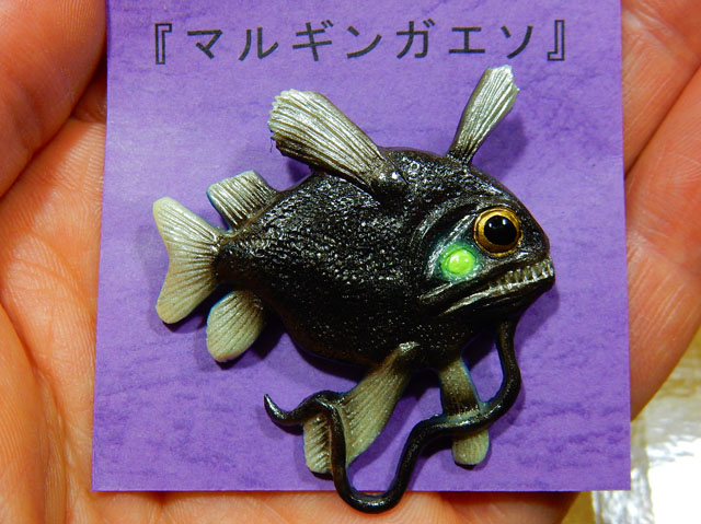 大寒の今朝も、縁台に置いたバケツに分厚い氷が張るほどの、たいへん厳しい冷え込みとなりました。。(>_<); しかし、早起きの楽しみのひとつである夜明け前の星空観察では、木星、火星、土星・・そして明るめの人工衛星もいくつか眺めることが出来ました。・°・。☆ 台所の窓辺に置いた人参のヘタ栽培ですが、寒さの中でもゆっくりと生長しております。窓際で朝陽をいっぱい浴びるようになってから、黄色かった芽もだいぶ葉緑素が増えて参りました♪ 都市近郊では近年スズメの数が減っているとの話をよく耳に致しますが、先日訪れた上野公園では、不忍池の周囲で何羽もの群れを見かけて安堵いたしました。。(*´-`) 大勢の観光客の落とす、お弁当やお菓子などのおこぼれを糧にしているようでした。・°・。* 本日も昨日に引き続き、ブローチ&帯留めのレリーフ作品の型抜き作業を行いました。特に帯留めの方は、埋め込み金具の固定には細かい神経を遣うので、精神的にも結構ハードです・・(・・;) 本日の拙作品アーカイブは「マルギンガエソ」のブローチ作品です。深海生物が好きでいろいろ手掛けていたのですが、この作品のモチーフは図書館で「禁帯出」の扱いになっていた、日本産魚類がイラストで満載された分厚い図鑑の資料からでした。貸出不可でしたので仕方なく・・・図書館に粘土を持ち込んでその場で原型造形いたしました・・・というのはもちろん冗談で、複写の許可を得て資料といたしました。・°・。その後、実物はイラストとはだいぶ異なる姿をしていることを知りましたが、過去の作品となってしまった今では、わたくし個人的には結構お気に入りの作品の一つとなっております(^-'*)♪ アトリエ☆イボヤギ 木村大介