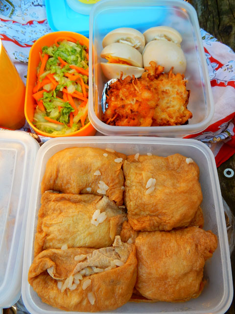 蝋梅園で目と鼻を楽しませていただいたあと、近くのベンチで友人と持ち寄ったピクニックランチにいたしました。・°・。手前が今朝こさえたお稲荷さんですが、慌てて詰めたので皮にご飯粒がまばらに付いております。。(-_-;) でもお味の方は美味しいと言っていただけました(*^_^*) 友人の方はニンジンと白菜の生姜漬けと、味付けゆで卵、白身魚とオニオンのフリッター、そして温かいお茶をいただきました。・°・。どれもいなり寿司との相性がとても良くて、たいへんおいしくいただきました(o^-^o)♪ ひだまりで食べていたからでしょうか? どこからともなく小さなユスリカのような虫がお稲荷さんに留まりました。。どうやら雌雄のペアのようで、よく見ると繋がっておりました。・°・。留まってみたものの、脚が貼り付いて動けなくなってしまったようだったので、割り箸の先で救出いたしました。しばらく脚に付いた甘い汁を拭っておりましたが、おそらく雌と思われる方は箸からわたくしの指の方へと移動いたしました。後で同定を試みましたが、この仲間の分類は大変に難しそうなので途中で諦めました。・°・。(^_^;) (その2へ続く・・・)