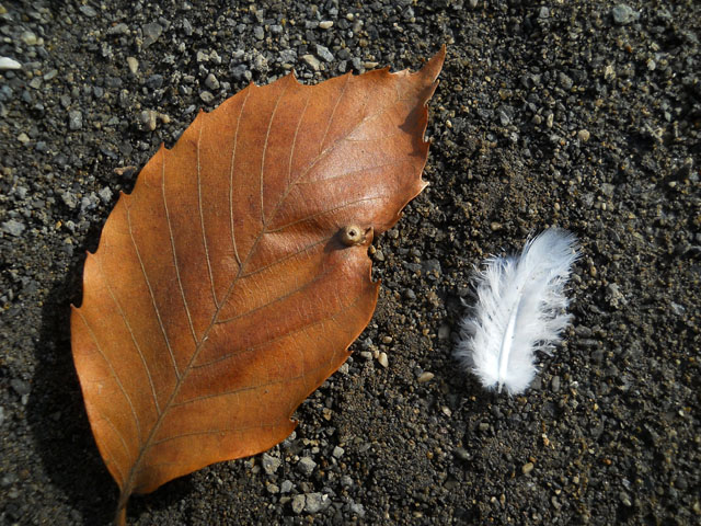 わたくしの住む古いアパートの裏庭には、大きな夏みかんの樹がございます。大家さんからは自由にとって食べていいと言われているので、柑橘好きのわたくしにはうれしい特典です。・°・。昨年は裏年であまり成りませんでしたが、今年は当たり年で樹が傾くほどの豊作となっております◎ 今の時期はまだまだ酸味が強すぎるので、春まで待って収穫する予定です。・°・。先日、木枯らしの吹き渡る市営グラウンドを歩いていると、虫こぶ(虫えい)の付いた枯れ葉が舞い飛んでおりました。・°・。 着地したそのすぐそばには、真っ白な小さな羽毛も風に乗って舞い降りました。・°・。枯れ葉を拾い上げて虫こぶの中を覗いてみましたが、すでに家主?は転 居された後のようでした。・°・。◎ アトリエ☆イボヤギ 木村大介