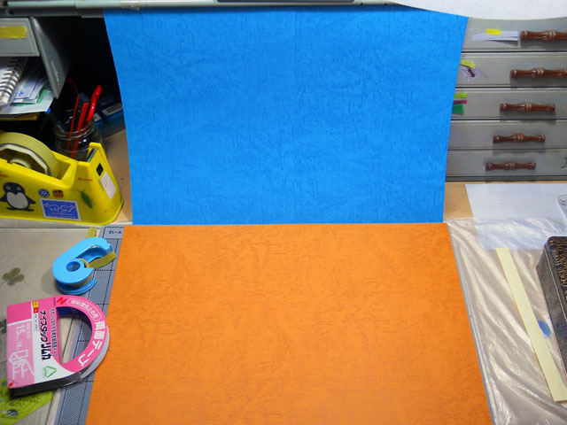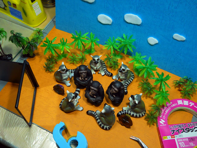 今年も年賀状作りを年末も差し迫ってからバタバタと取り掛かりました。・°・。毎年、版画にするか自作品を用いたジオラマ仕立ての写真にするかで迷いますが、来年の年賀状はジオラマ撮影ということで落ち着きました。まずは卓上に色紙を敷いて、空と大地のベースを整えました。青空には白いフリース生地の雲を配置して、地面にはミニチュアの椰子の樹を並べました。そして厳正なるオーディションを経て選抜された、役者さんたちの演技指導を行って無事に撮影は完了いたしました。・°・。◎
