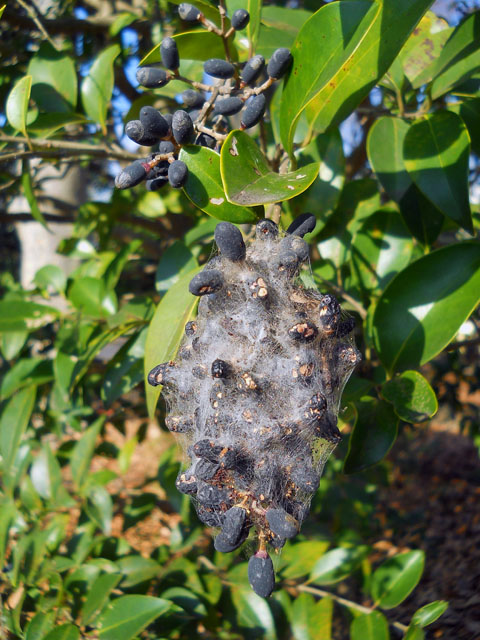 近くの公園の垣根のネズミモチの樹には、たくさんの青黒い実が成っておりますが、そのうちの一房にクモの巣のような、糸というか繭のような素材がまとわり付いていて、綿菓子のようにも見えました。・°・。陽に透かして見てみるとクモの仔のようにも思える、小さな粒々も見えましたが、果たしてそれが仔グモたちの揺り籠なのかどうか定かではありませんでした。・°・。包まれたネズミモチの実の方をよく見ると、表面に食べられた痕のような小さな穴も多く認められましたので、もしかしたら蛾などの幼虫が、安全に食事を進めるためにこさえた防御ネットだったのかもしれません。・°・。* アトリエ☆イボヤギ 木村大介