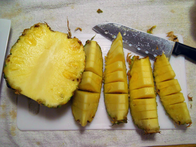 久しぶりに生のパイナップルを丸ごとひとつゲットいたしました。早速葉を切り落として、縦切りにして芯の部分を取り除き、食べやすいようにカットいたしました。・°・。缶詰よりもしっかりとした歯応えと爽やかな酸味が感じられるので、わたくしは生パイナップルの方が好きです(o^-^o)♪ アトリエ☆イボヤギ 木村大介