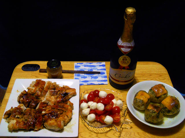 鶏胸肉のソテーはバルサミコ酢を使った特製ソースで仕上げました。・°・。今宵の満月のようなひと口サイズのモッツアレラチーズは、チェリートマトといっしょにラズベリー酢のドレッシングで和えました。・°・。ごちそうが並んだところで友人が差し入れてくれた、辛口で美味しいスパークリングワインで乾杯をしていただきました(o^-^o)♪。・°・。* アトリエ☆イボヤギ 木村大介