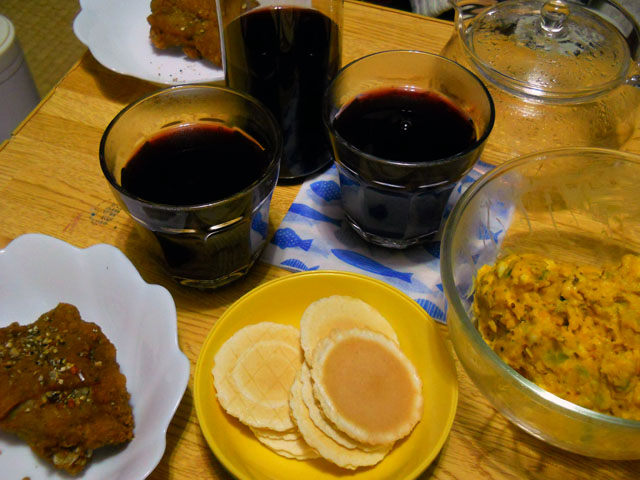 冷え込みが予想されていた関東地方南部でしたが、昼間の陽射しは暖かくて風が吹かなければだいぶ過ごしやすいクリスマスでした。・°・。拙宅の周辺で富士山の見える方角を眺めると、空高く厚みのある大きな雲の下では、雨か雪が降っているかのような縞模様が見えました。・°・。* 今日は友人が訪ねて来てささやかなクリスマス会を開きました。・°・。ランチタイムは友人が調合したホットワインを飲みながら、クラッカーにかぼちゃサラダを載せて、フライドチキンなどといっしょにいただきました。・°・。冬至の日にかぼちゃを食べ損ねたので、それも兼ねてチーズ入りのかぼちゃペーストとしておいしくいただきました♪