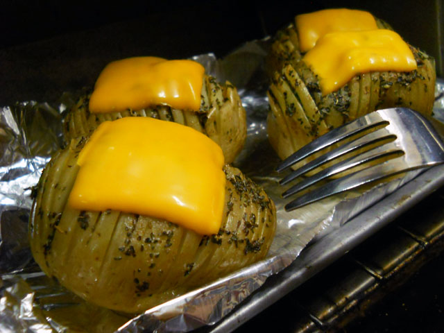 帰宅後はディナーの支度に取り掛かりました。・°・。わたくしは料理の得意な友人のアシスタントに徹して、お手伝いさせていただきました( ̄^ ̄)ゞ じゃが芋は皮をゴシゴシとタワシとスポンジでよく洗って、その上面に蛇腹に切れ込みを入れて、切れ目にバジルとマーガリンを練り込んだものを詰め、チーズを載せてオーブントースターで焼きました。・°・。
