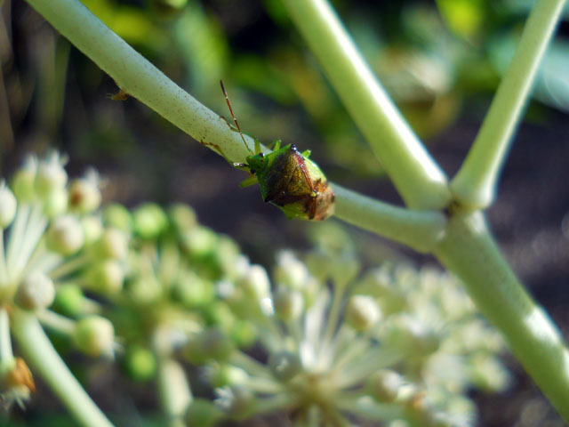 昨夜は珍しく早目に就寝したので、今朝は久し振りに5時起き出来ましたヽ(´▽`)/ 早起きするだけで、同じ時間働いてもどうしてこんなにも作業効率が上がるのでしょうか・・?頭では分かっていながら、ついつい夜更かしして夜型に偏った生活パターンに陥りがちなこの頃を反省いたしました。。(*´-`) 今日の作業はブローチ作品の素材の表面を、研磨剤で磨く作業を行いました。こうすることで、塗料の喰い付きを向上させてより剥げにくくする効果があります。・°・。◎ 先日友人がこさえてくれたカボチャの豚肉ロールがとても美味しかったので、残っていたカボチャを使って、似たようなモノを自作しました。。豚バラ肉で巻く代わりに豚こま肉とキャベツも加えて、なるべく薄切りにしたカボチャをいっしょに炒めて塩胡椒で味付しました。友人作のと比べたらだいぶ見劣りしましたが、味の方はなかなかイケました(^-'*)♪  先日訪れた井の頭公園のヤツデの花に集まっていた虫たちの中に、きれいな緑と茶色の艶やかなカメムシさんもおりました。名前を調べてみましたが、アオモンツノカメムシかな・・?と思い至りました。。虫たちの少ない冬に咲くヤツデの花には、特別に甘い蜜があるそうですが、カメムシさんもそんな貴重な蜜に誘われてやって来たようです。・°・。アトリエ☆イボヤギ 木村大介