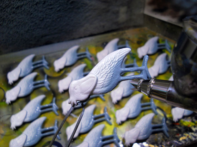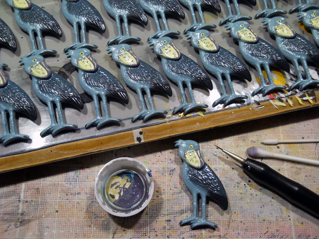 今日は朝方雨まじりの曇り空で一日薄暗いお天気でしたが、湿度があったせいか気温の方はあまり寒く感じませんでした。・°・。本日もブローチ類の制作を続けました。写真はハシビロコウの塗装工程に入ったところです。最初にベース色となるブルーグレイ調の塗料を、エアブラシで吹き付けてゆきます。・°・。* 先日訪れた井の頭公園の八手の花・虫々リポートの続きは。。象の鼻のような長い口吻をしたツマグロキンバエさんたちです。・°・。どことなく憎めないユーモラスな顔立ちの彼らが結構好きです♪ その長い口をせわしなく動かして、無我夢中で蜜をなめ集めておりました。・°・。*