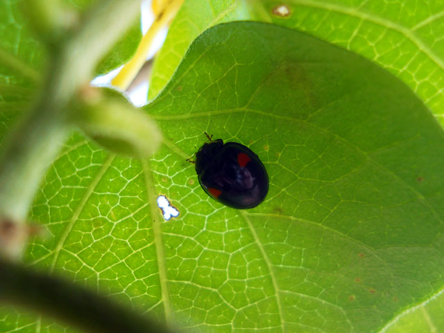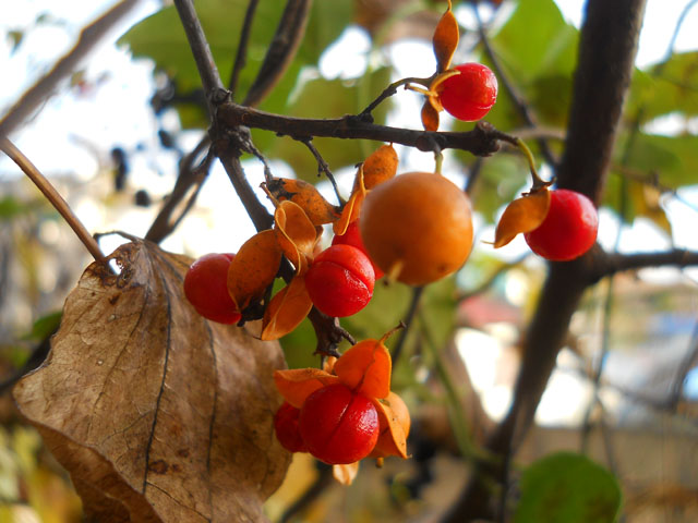 線路沿いにあるフェンスの外には、朱色の種皮を付けた鮮やかな朱赤の実がたくさん成っておりました。あとで調べたらツルウメモドキの実だと判りました。人が食してもあまりおいしくは感じられないそうですが、鳥や獣にとっては食物の少ない冬の、貴重な食料源になっているようです。・°・。同じフェンスに絡まったつる草の葉の裏には、ナミテントウさんがおりました。暖かい日でしたが、既に今年の活動を休止宣言した後だったのか・・?じっと休んでいる様子でした。・°・。●