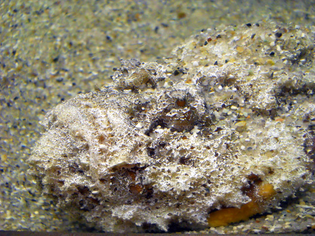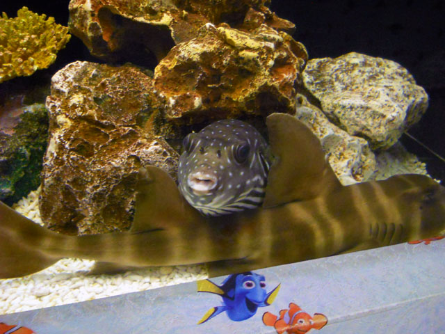 北三陸・久慈の旅の二日目は市内にある「もぐらんぴあ・まちなか水族館」に参りました。・°・。東日本大震災により全壊してしまった久慈地下水族科学館は、現在復興に向けてリニューアル工事中ですが、それまでの間さかなクンを始め水族館関係者、久慈市民や全国からの声援を受けて出来た施設が「まちなか水族館」とのことです。館内にはさかなクンの描いたイラストがあふれていて、とても楽しく賑やかな雰囲気でした♪  順路の最初にあるのは、さかなクンコーナーといって、さかなクンのフィッシュハウスからやって来た仲間たちが展示されておりました。サンゴ砂の上にいた美しいアカシマシラヒゲエビさんが出迎えてくれました。・°・。砂の上にサンゴ岩のようなゴツゴツしたモノは、よく見たら・・ツノダルマオコゼとオニダルマオコゼさんでした。。そのあまりに見事な擬態っぷりに感心いたしました・・(°▽°)!