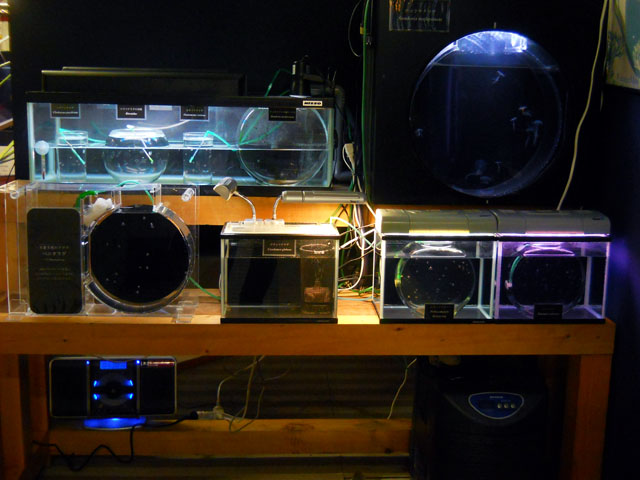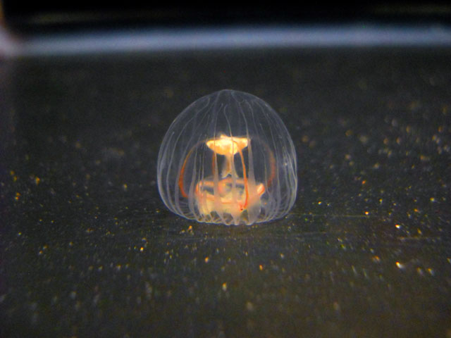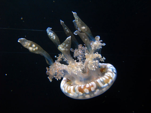 クラゲのコーナーでは、職員さんのたゆまぬ努力に寄って累代飼育に成功した地元採集のクラゲを始め、様々な種類のクラゲを展示しておりました。左下の写真はタコクラゲさんです。・°・。三三三D