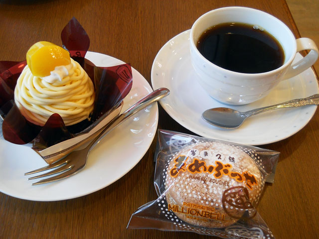 水族館でたくさんの生き物たちに癒やされた後は、鶏丸ごと出汁スープと自家製麺の「らーめんの千草」でお昼にしました。冷たい風にさらされた身体もすっかりと温まりました。・°・。食事の後はカフェスペースのある洋菓子屋さん「ミリオンベル」で、ケーキセットと銘菓「まめぶっせ」をいただきました。ケーキはどれも美味しそうで迷いましたが、今回はモンブランにいたしました。そして「まめぶっせ」はうわさに違わぬ美味しさでしたので、お土産にも箱入りのを買い求めました(o^-^o)♪